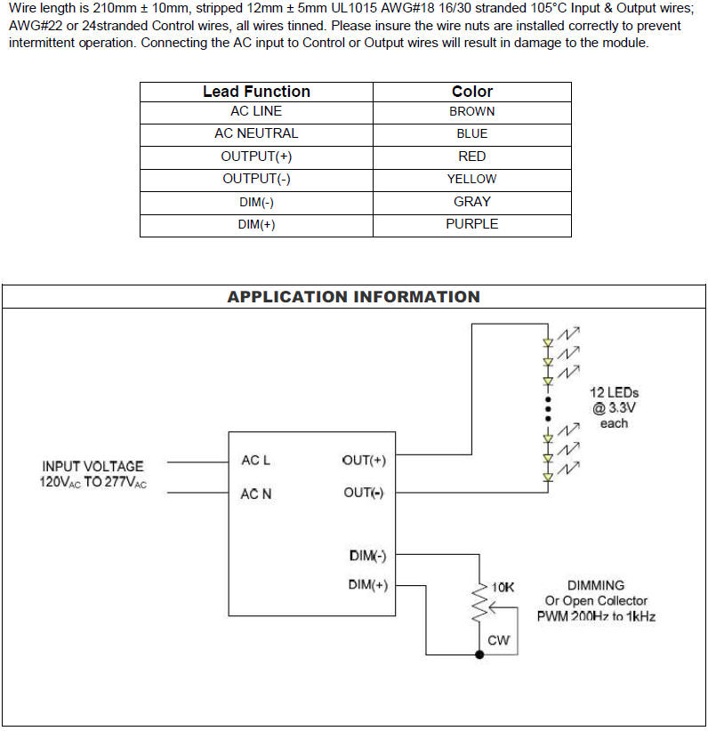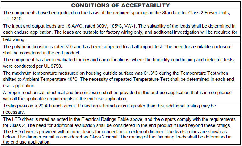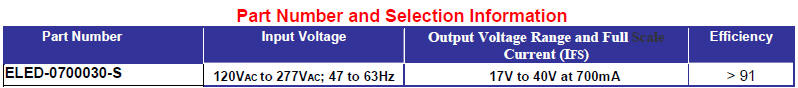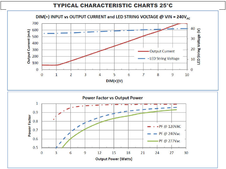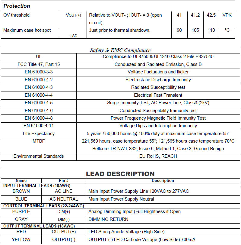 Description ELED-0700030-S is a highly reliable 30w solid-state LED lighting driver module with a galvanic isolated output. It is compliant to Energy Star for commercial, industrial and residential applications. It is compatible with 50Hz and 60Hz AC power sources worldwide with standard voltages ranging from 120VAC +/- 10% to 277VAC +/- 10%. The output is a 700mA dimmable constant currentsource. It complies with UL, CUL and CE standards for safety standards and EMC. Low voltage dimming control is available when using the dedicated dimming control input leads, DIM(+) and DIM(-). The amplitude of the output LED string current will vary from 10% to 100%corresponding to a 1VDC to 10VDC signal on DIM(+) input following IEC 60929 Annex E.2.3. A minimum dim level of 10% shall be obtained with DIM(+) input shorted to DIM(-). |
