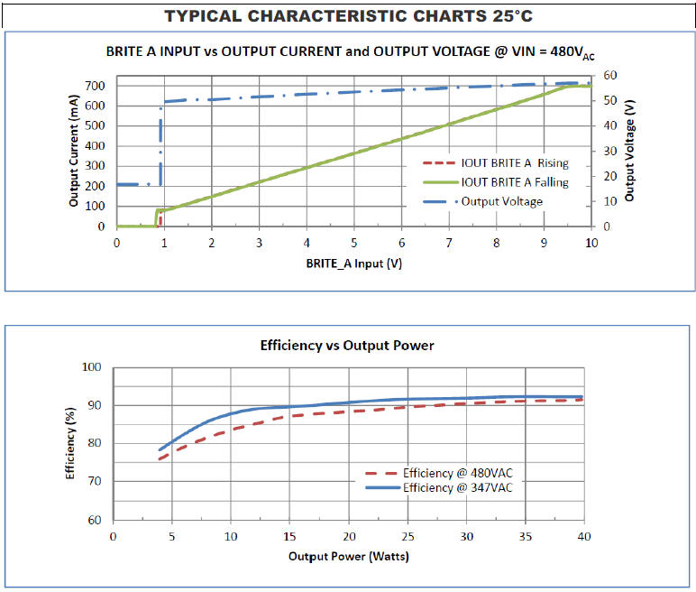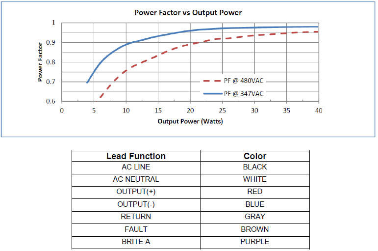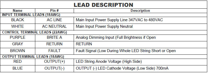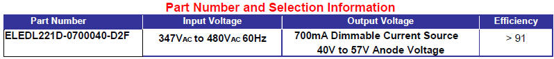 Key Features • High Voltage AC Input: 347VAC to 480VAC • High Efficiency • Active Power Factor Correction • Constant Current 700mA • Dimming Input Provides 10% to 100% Range, Plus Shutdown • Anode Supply Adjusts for String Voltage between 40V and 57V • Small Compact Size |
