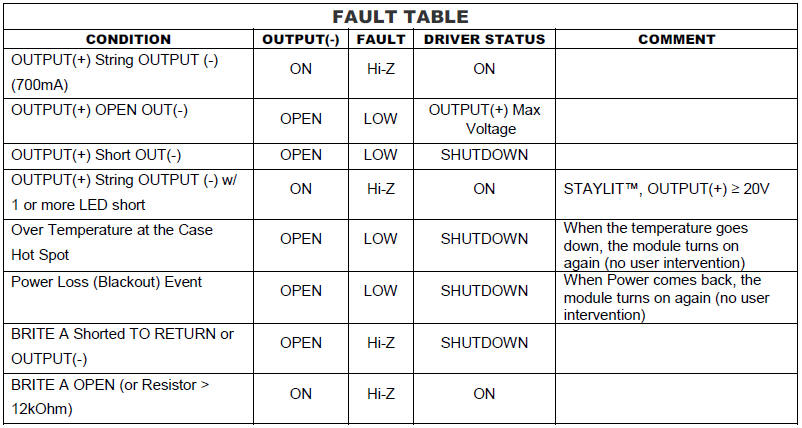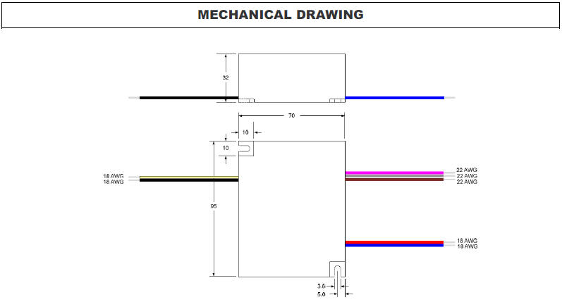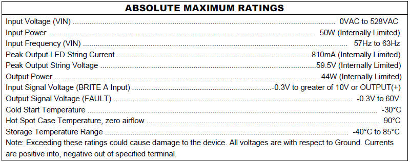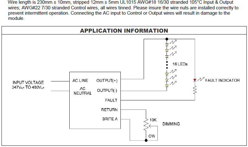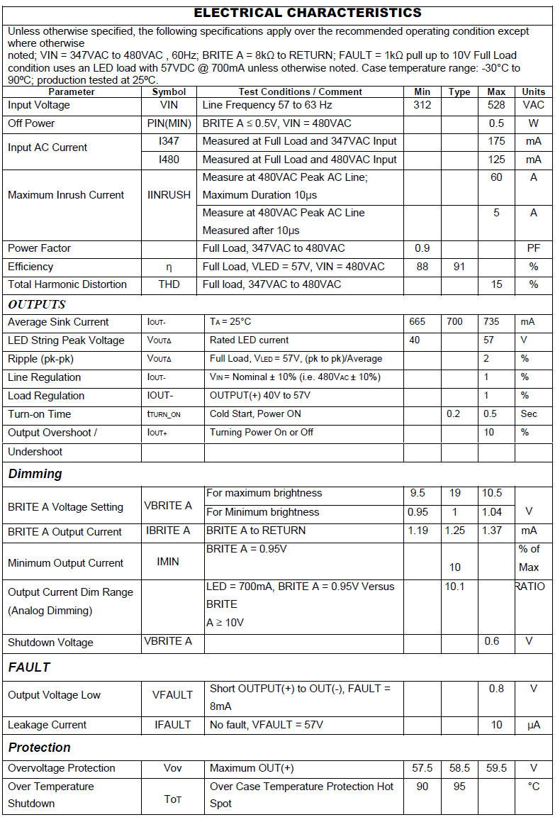 Description ELED-0700040-S is a fully enclosed compact solid-state LED lighting driver module. It operates from a universal AC input supply in the range of 347VAC to 480VAC, 60Hz to drive a string of LEDs with active power factor correction. LED string voltage can range from 40V to 57V at a constant current of 700mA.Control terminal leads include a dimming input BRITE A with a dedicated RETURN lead. The amplitude of the output LED string current will vary from 10% to 100% corresponding to a 1VDC to 10VDC signal on the BRITE A input following the 0V to 10V ESTA E1.3-2001 Analog Control Specification Standard. The BRITE A terminal when pulled down below minimum dimming will turn off the LEDs and enter a low power consumption mode. A second control terminal lead provides a FAULT indicator. In the case that there is an LED string short between OUTPUT(+) and OUTPUT(-), or string open, or a product over temperature condition the FAULT terminal will go low.The FAULT terminal includes an open collector device that can be pulled up to a maximum of 60V and will sink 8mA typical to 0.8V when a short or open fault occurs. To reduce audible noise the internal switching frequency remains above 30kHz. Safety features include open output circuit protection, whole string short circuit protection. The maximum allowable hot spot case temperature is 90°C (above this temperature the module will be thermally self protected). The recommended operating ambient temperature range is -30°C to 70°C, as long as the maximum case temperature is not exceeded. The compact enclosure is rated to IP66, meets UL8750 and UL1310 class 2. |
