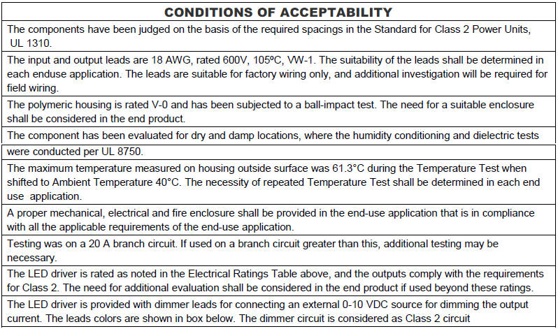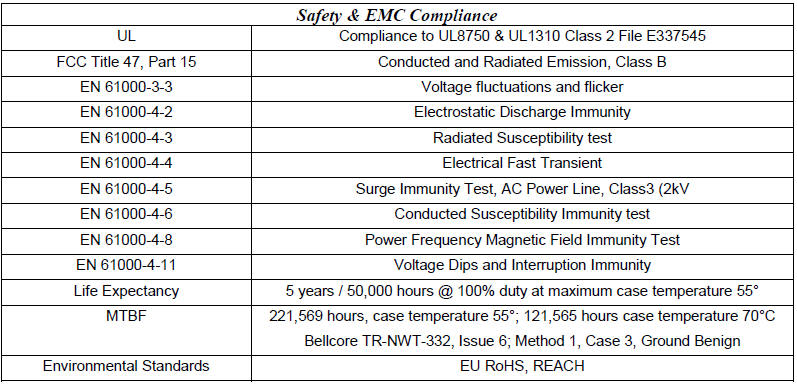 • Suitable for Damp Locations (IP66) • UL8750 & UL1310 • UL File E337545 • FCC Class B • Long Life Expectancy • RoHS Compliant • Full Protection: OVP, SCP, OTP, Maximum Power Limit • Unique Fault Detection and Management |